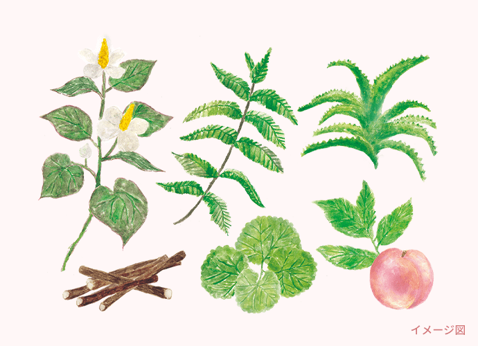 ドクダミエキス、ツボクサ葉エキス、アロエベラ葉エキス、メリアアザジラクタ葉エキス、モモ葉エキス、グリチルリチン酸2K(保湿成分)を配合。6種類の保湿成分配合で潤いを与え、肌荒れを防ぎます。