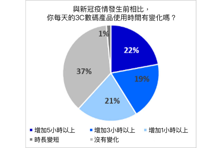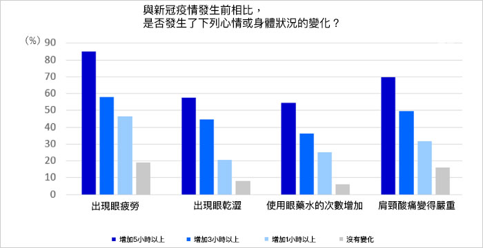 在2020年5月「關於生活形態的調查」中,大部分受訪者都表示在家遠程辦公時間的增加,令他們的眼疲勞問題變得更為嚴重。在家遠程辦公時,工作時需要長時間用電腦上網辦公,閒暇時則在家裡滑手機追劇,這些都導致每天使用3C數碼產品的時間大幅增長。