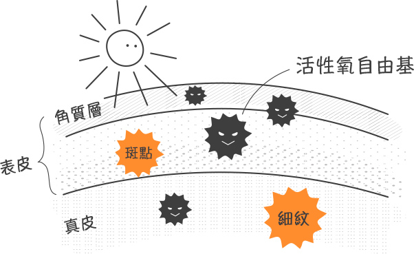 在被紫外線照射短短幾分鐘後,肌膚表面就會出現活性氧自由基,損傷皮膚,帶來斑點與細紋。