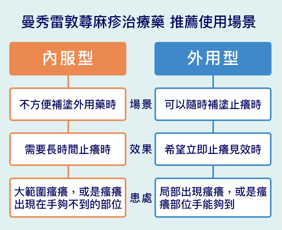 若蕁麻疹出現在外用藥難以塗抹到的部位、瘙癢蔓延全身、或是症狀反復出現時,推薦使用曼秀雷敦蕁麻疹內服藥來進行護理。