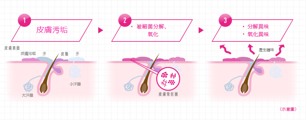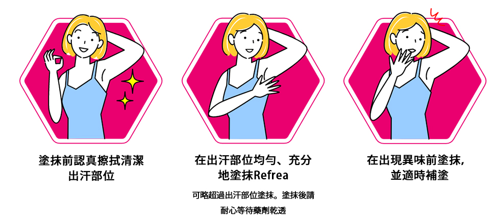 研究顯示,造成體味的主因為皮脂及汗水中所含的成分被體表的細菌分解而產生的分解臭或酸化臭。因此,抑制體味時,僅憑香氣和止汗是不夠的。曼秀雷敦Refrea透過徹底殺死體表的細菌,使惱人的體味消失無蹤。
