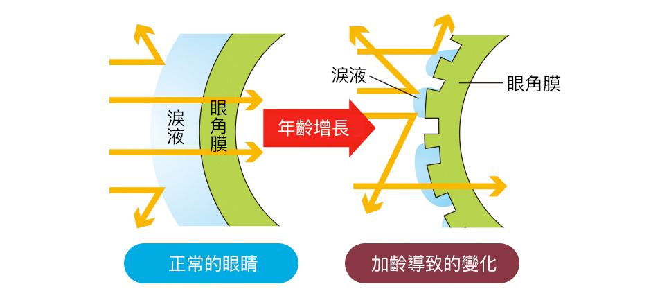 隨著年齡的增長,眼睛機能也在逐漸發生變化。常見的眼睛老化症狀包括:眼睛聚焦能力變差導致看近物、看細小文字時特別吃力;淚液分泌減少引起眼睛乾澀;角膜細胞代謝能力的衰退導致眼疲勞難以恢復。