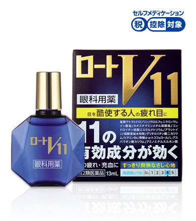 樂敦V11眼藥水(ロートV11)是樂敦品牌眼藥水中唯一一款添加了3種抗炎成分(尿囊素、硫酸鋅、甘草酸二鉀)的產品,能有效抑制因長時間用眼的眼疲勞引發的眼部炎症。此外,還添加了改善睫狀肌調節功能的甲硫酸新斯的明,抑制眼睛瘙癢的馬來酸氯苯那敏,促進眼部細胞新陳代謝、緩解眼疲勞的多種維他命等合計11種有效成分,多管齊下解決眼疲勞問題。