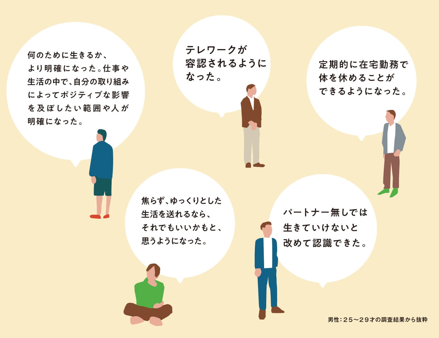 新型コロナウイルス影響前との意識の変化。男女ともに約5人に1人が、「ライフプランについてじっくり考えるようになった」「仕事よりも家庭やプライベートを大切にしたいと思うようになった」と答えるなど、自分の人生、家族の重要性について思いをあらたにする人も多くみられます。