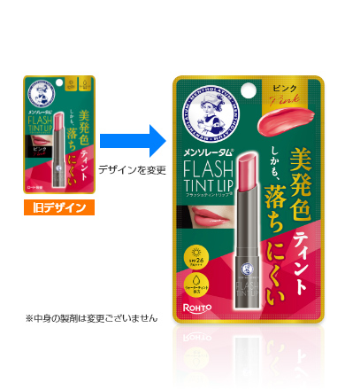 「フラッシュティントリップ(ピンク)」は、ウォーターティント処方を採用し、時間が経っても、唇の水分に反応することで発色が長続きする色つきリップです。こだわりの6種のトリートメントオイル