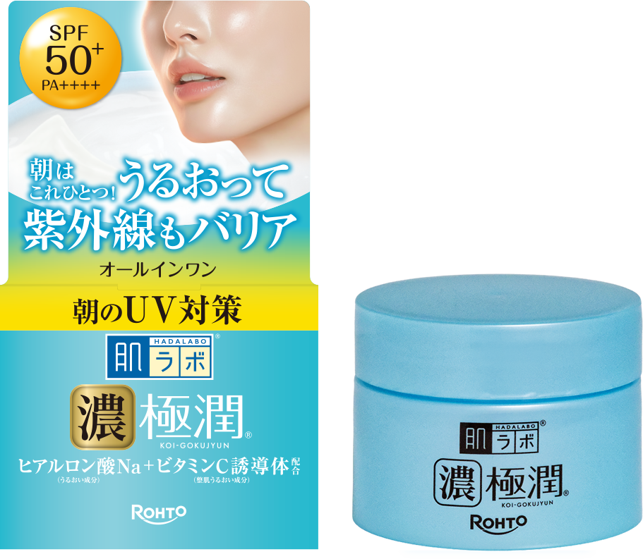 肌ラボ®濃極潤®朝のUV対策オールインワン うるおって紫外線のバリア!うるおい肌 SPF50+/PA++++ 2種のヒアルロン酸※1(うるおい成分)+ビタミンC誘導体※2(整肌うるおい成分) ハダラボUVホワイトゲルa (ジェル状保湿液) ※1ヒアルロン酸Na、ナノ化ヒアルロン酸(加水分解ヒアルロン酸) ※2リン酸アスコルビルMg