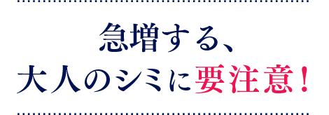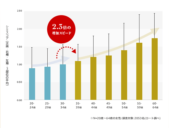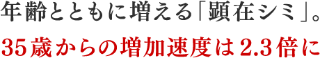 「顕在シミ」とは、いま目に見えているシミのこと。 その増加速度は、年齢とともに上がることが明らかになっています。 特に増加速度が2.3倍に急増する〔35~65歳〕は危険信号! 紫外線ダメージをシミにしないケアで、隠れているシミが一気に現れる前に、早めの予防対策が大切です。 肌ラボ®のベースにあるものは、ロート製薬ならではの肌研究の積み重ね。妥協のない成分選びと、品質と安全性にこだわった管理のもとで、本当に安心いただける商品開発を追求しています。 肌の必要な部分に、いかに効果のある成分を働かせるか...に加え、気持ち良く使っていただける使用感にもしっかりこだわっています。肌ラボ®はこれからも、お客様のお肌にいい商品をお届けしていきます。