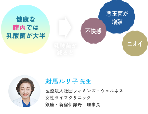 健康な腟内は乳酸菌の効果で弱酸性に保たれており、雑菌の繁殖を防ぐ自浄作用がありますが、睡眠不足や偏食、疲れ、ストレスなどの様々な要因で乳酸菌が減ってしまうと、外陰部のニオイや不快感に繋がることも。
