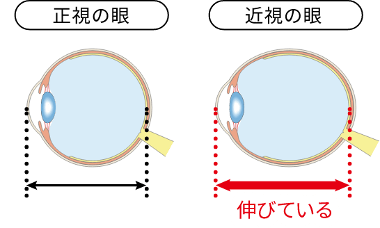 近年、生活環境の変化などにより、日本を含むアジア諸国で近視が増加しています。正視の人と比べて、強い近視の人は眼が前後方向に大きく伸びています。眼が伸びると神経や血管が引き延ばされてしまうことも。その結果、緑内障の発症リスクが高くなるといわれています。
