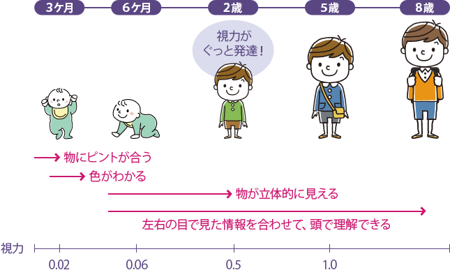 子どもの近視は年齢があがるにつれて進行することが多く、発症年齢が早いほど、将来、より強い近視になる傾向があります。