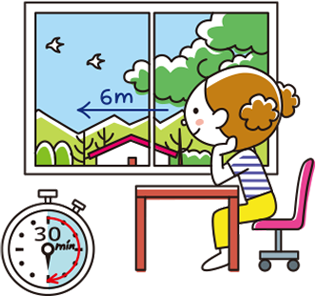 ノートやタブレット、スマートフォンの使用など、近くを見る作業を長く続けると、目に負担がかかります。 目を休めるために、30分に1回は20秒以上遠くを見て、目を休めましょう。*米国眼科学会議は「20-20-20 ルール」を推奨しています。連続して20分デジタル端末画面を見たら、20フィート(約6m)離れたところを20秒以上見る、という内容です。