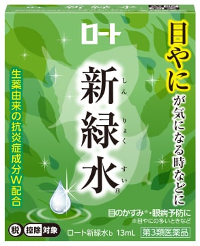 ロート新緑水は目やにの悩みを考えた処方設計。ダブルの製薬由来の抗炎症成分※6が炎症をしっかり鎮めて、目のかすみ※1、眼病予防に効果を発揮する目薬です。