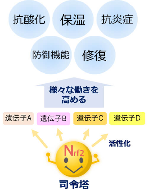 Nrf2はタンパク質の一種で、紫外線ダメージを感知すると抗酸化、抗炎症、保湿、修復などに関わる数百以上の遺伝子を活性化します。