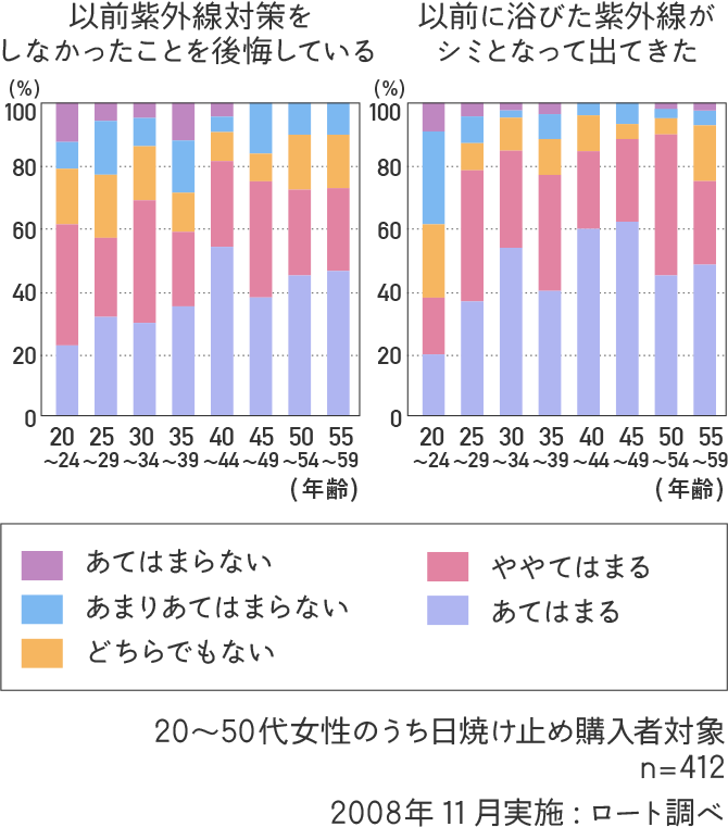 紫外線に対する意識調査を年代別に行ったところ、「以前紫外線対策をしなかったことを後悔している」「以前に浴びた紫外線がシミとなって出てきた」のいずれの項目においても40代を境に自分に当てはまると感じられる方が多く、過去の紫外線ケアを後悔していることがわかりました。