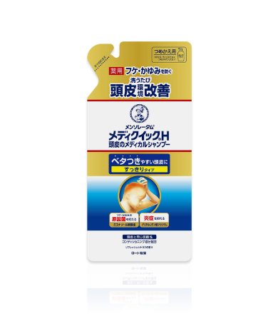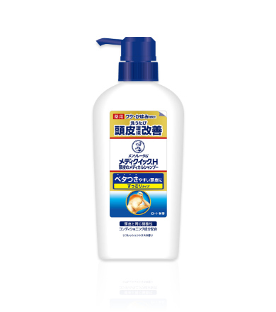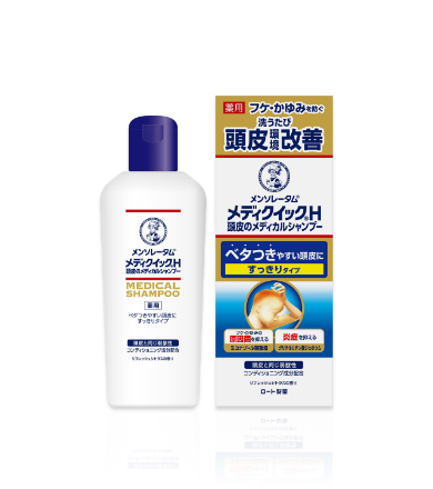 「メンソレータムメディクイックH頭皮のメディカルシャンプー すっきりタイプ」は、フケ・かゆみの原因菌を抑える抗真菌成分(ミコナゾール硝酸塩)と、炎症を抑える抗炎症成分(グリチルリチン酸ジカリウム)を配合した薬用シャンプー。フケ・かゆみの原因菌に働き、洗うたび頭皮環境を改善します。