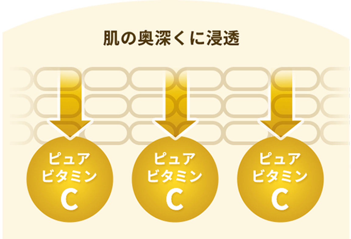 一般的には壊れやすく不安定なビタミンC(ピュアビタミンC※1)を、ロート製薬の長年の研究により安定して配合することに成功しました。 この、ビタミンCそのものであるピュアビタミンC※1が、ぐんぐん角質層の奥まで浸透します。