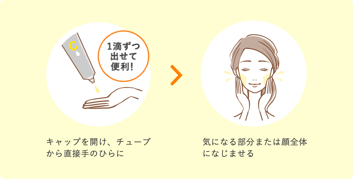 洗顔後に化粧水等でお肌を整えた後、適量を手のひらにとり、気になる部分または全体になじませてください。