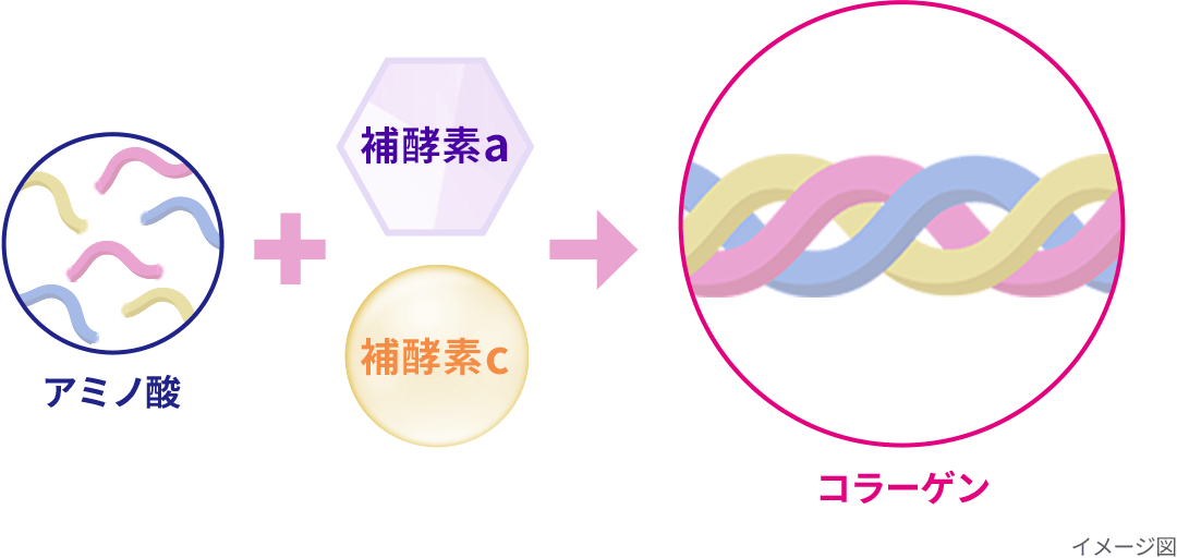 アミノ酸などが繋がり長い繊維状のコラーゲンに。さらにそれらがらせん状の太い束になって働きます。