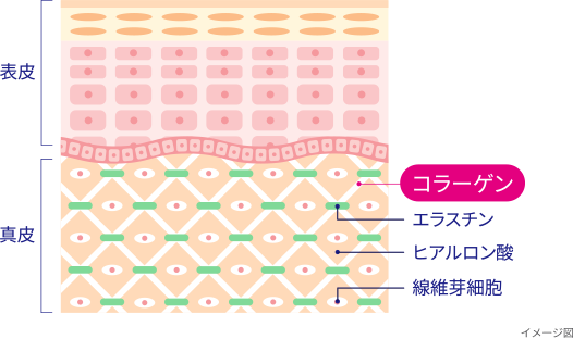 肌をはじめ、骨、血管、頭皮など様々な部位に存在します。肌では真皮の約70%がコラーゲンです。