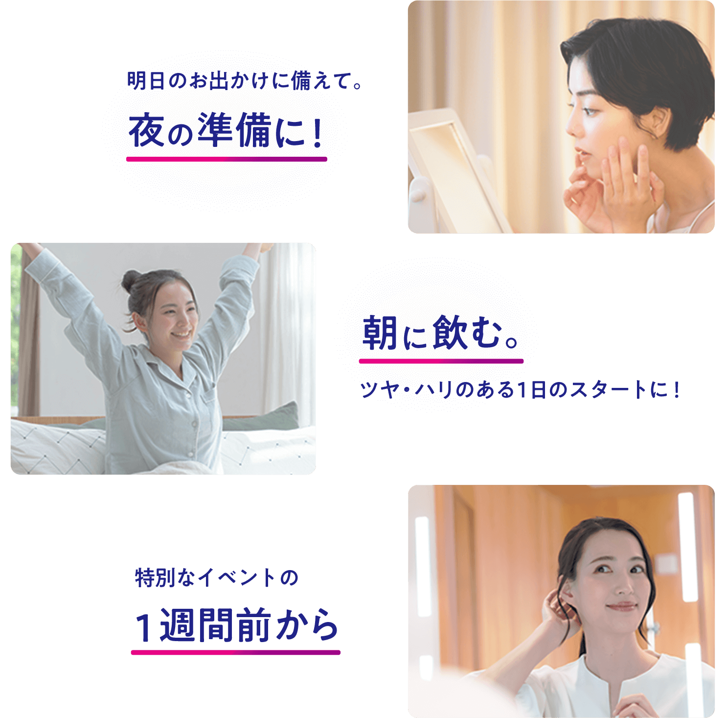 コンディションに合わせて、お好きなタイミングで飲んでいただけます。