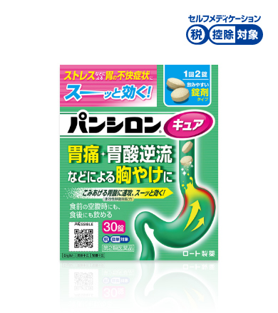 「パンシロン キュアSP錠」は、胃痛や胃酸が逆流することにって起こる胸やけによく効く「トリプルアクション®」処方を採用。胃酸の分泌を抑制して、出過ぎた胃酸を中和し、荒れた胃粘膜を修復・保護します。さらに、弱った胃の働きを高める健胃生薬チンピ末も配合しました。