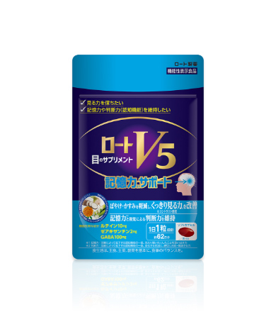 「ロートV5 記憶力サポート」は、加齢によって低下する見る力※1と認知機能※2に注目し、3つの機能性関与成分(ルテイン、ゼアキサンチン、GABA)を配合した機能性表示食品です。